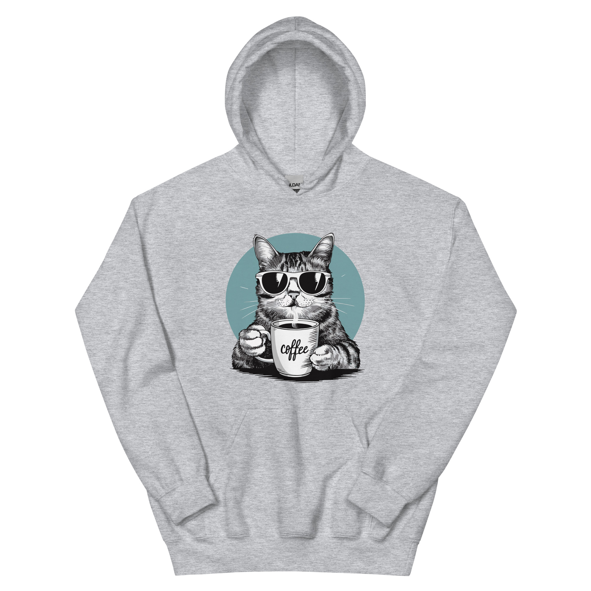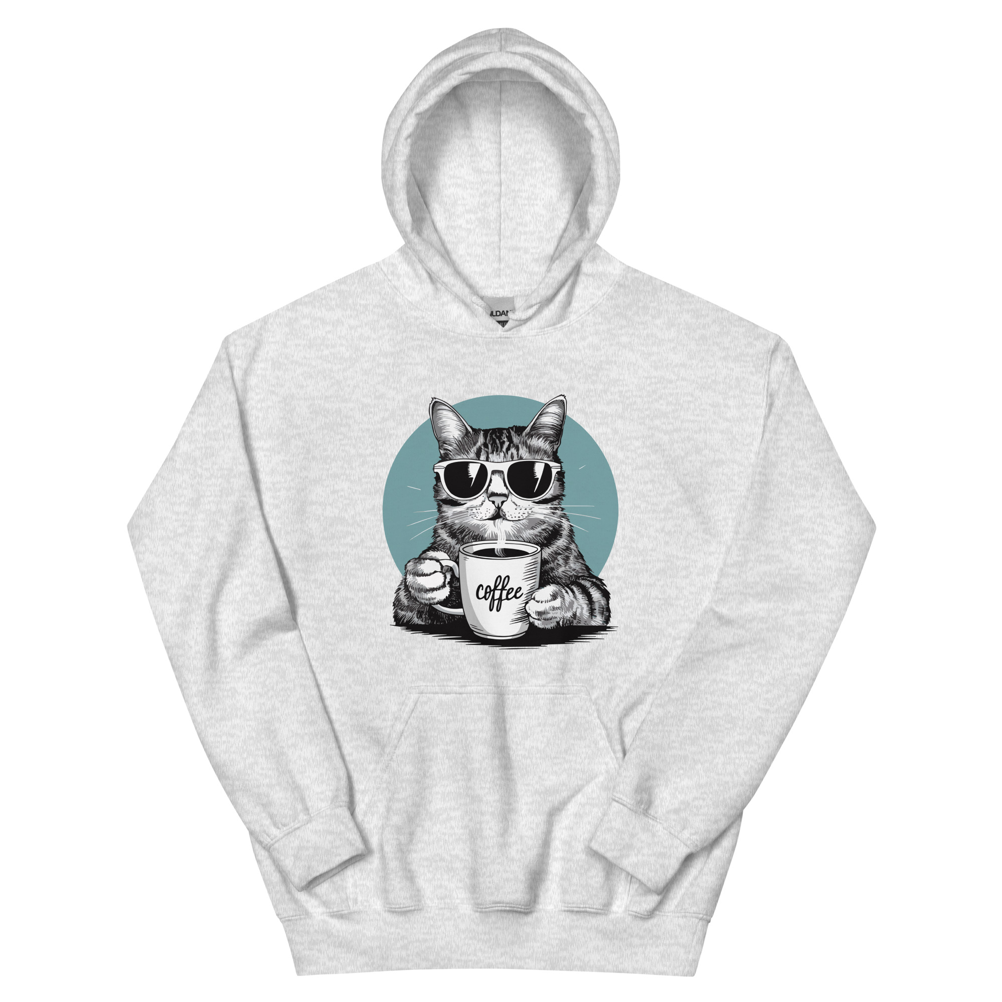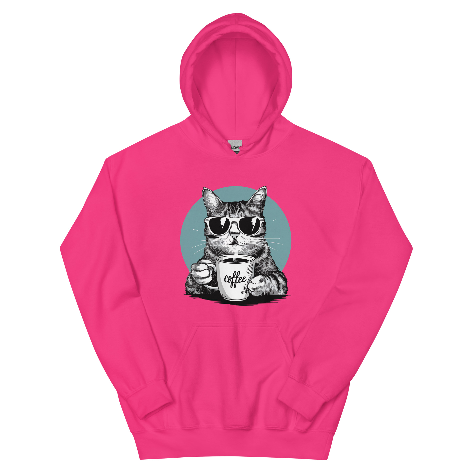 This hoodie isn’t just warm—it’s got attitude. Featuring a slick illustrated cat rocking shades and clutching a steaming cup of coffee, this design is made for coffee lovers and cat fans who know how to keep it chill while fuelling up.